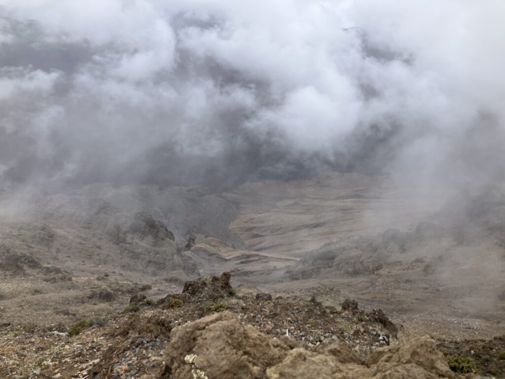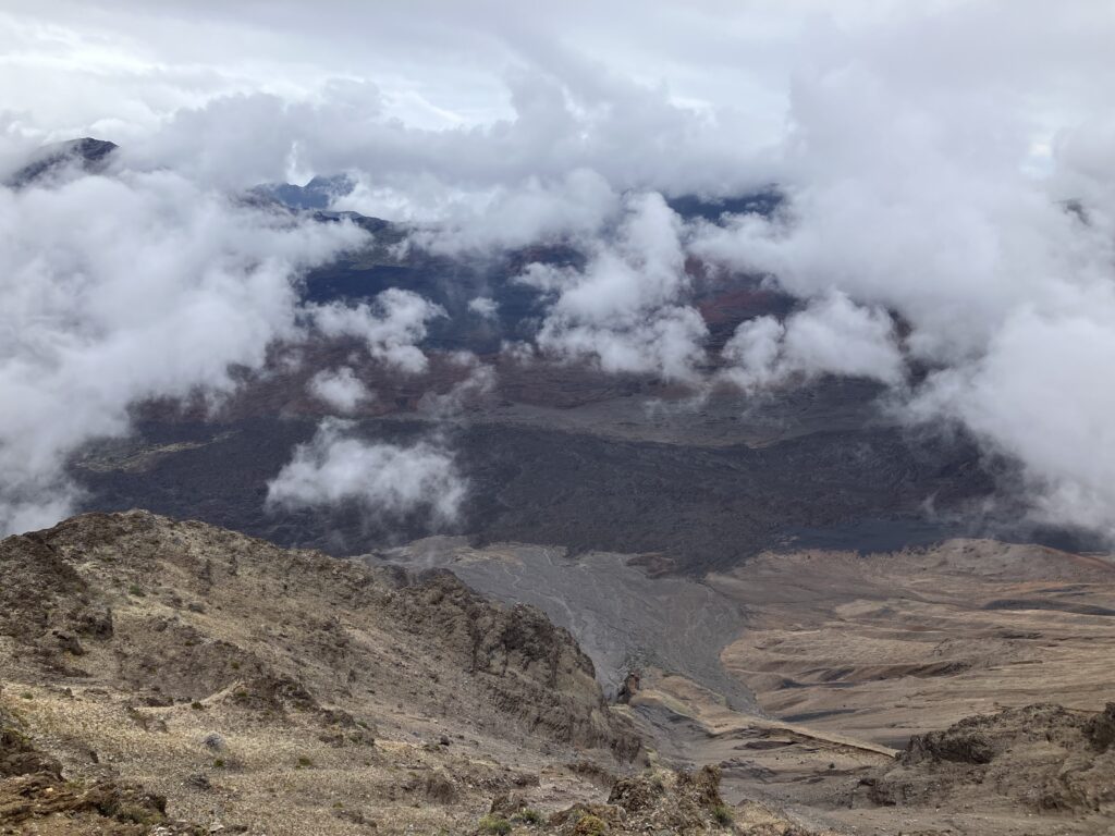 First, it was cold. I knew it would feel cold relative to the balmy perfect beach below, but it was like being back in the Bay in the wintertime. At the summit it was colder. Also it was foggy, just like home, damp and cold foggy. Sometimes I could see the ocean below, but mostly not. And it was rocky, not easy joyful hiking, but watch-where-your-feet-are hiking. Also it’s “at elevation” (as my mountain climbing son says), so there are warnings about altitude sickness everywhere, which made me hyper vigilant about water and snacks. Finally, every hike is into the crater and out of the crater, down and then unfortunately up.
